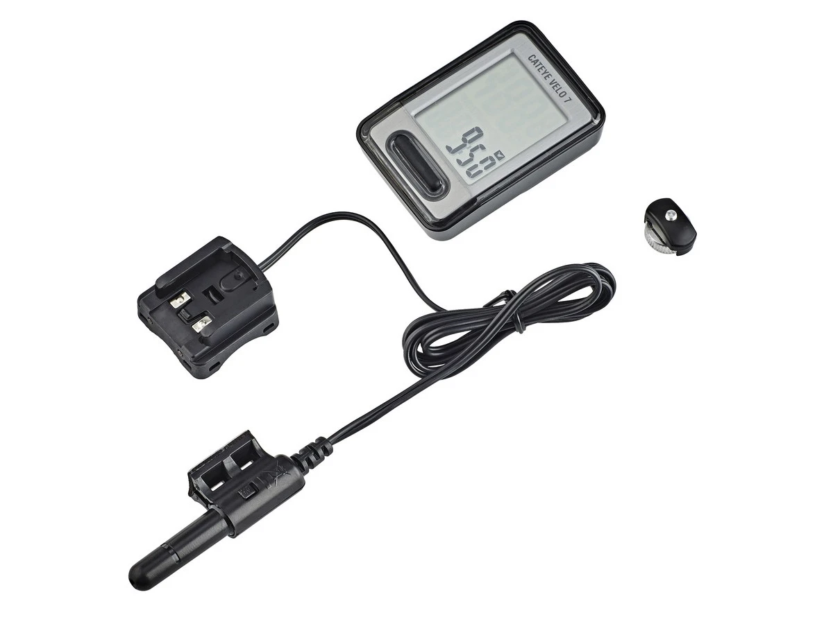 Cateye Velo 7 er en cykelcomputer med 7 funktioner. Cykelcomputeren har et stort display, der gør det nemt at se tallene under kørsel, og den gør det muligt at måle eksempelvis hastighed, distance samt tid. Velo 7 VL-520 kommer med forprogrammerede dækstørrelser samt har målene 55,5×37,5×18,5 mm.