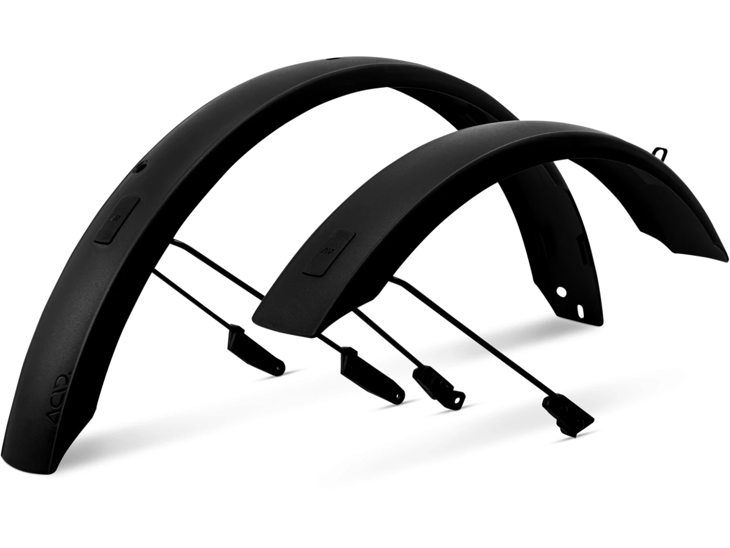 Disse smarte cykelskærme fra Cube er perfekte til minicykler og andre 20″ cykler med brede dæk. Skærmsættet er lavet til at passe perfekt på Cubes Compact Hybrid fra år 2020 og frem. De er kompatiple med Cube Acid bagagebærer, som monteres uden afstivere til sadelpinden, men direkte i skærmen og ned til navet.