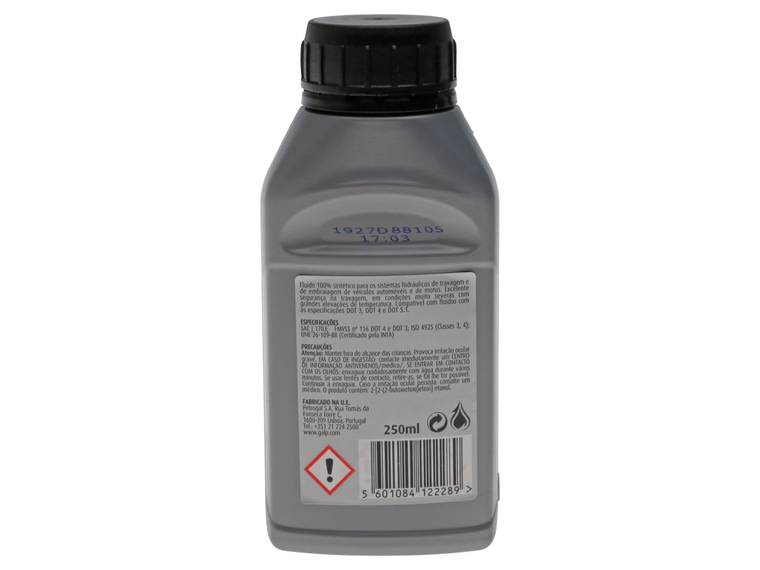 Galp Expert Trávia DOT 4 er en syntetisk bremsevæske fremstillet til brug på hydrauliske bremser og koblinger for at sikre at sikkerheden på din maskine er i top og at bremserne fungerer optimalt. Bremsevæsken er fuldt kompatibel med DOT 3, 4 og 5.1 bremsevæsker og den unikke formel sikrer gode bremseevner selv ved høje temperaturer og ekstreme forhold. Galp Expert Trávia DOT 4 indeholder 250 ml.