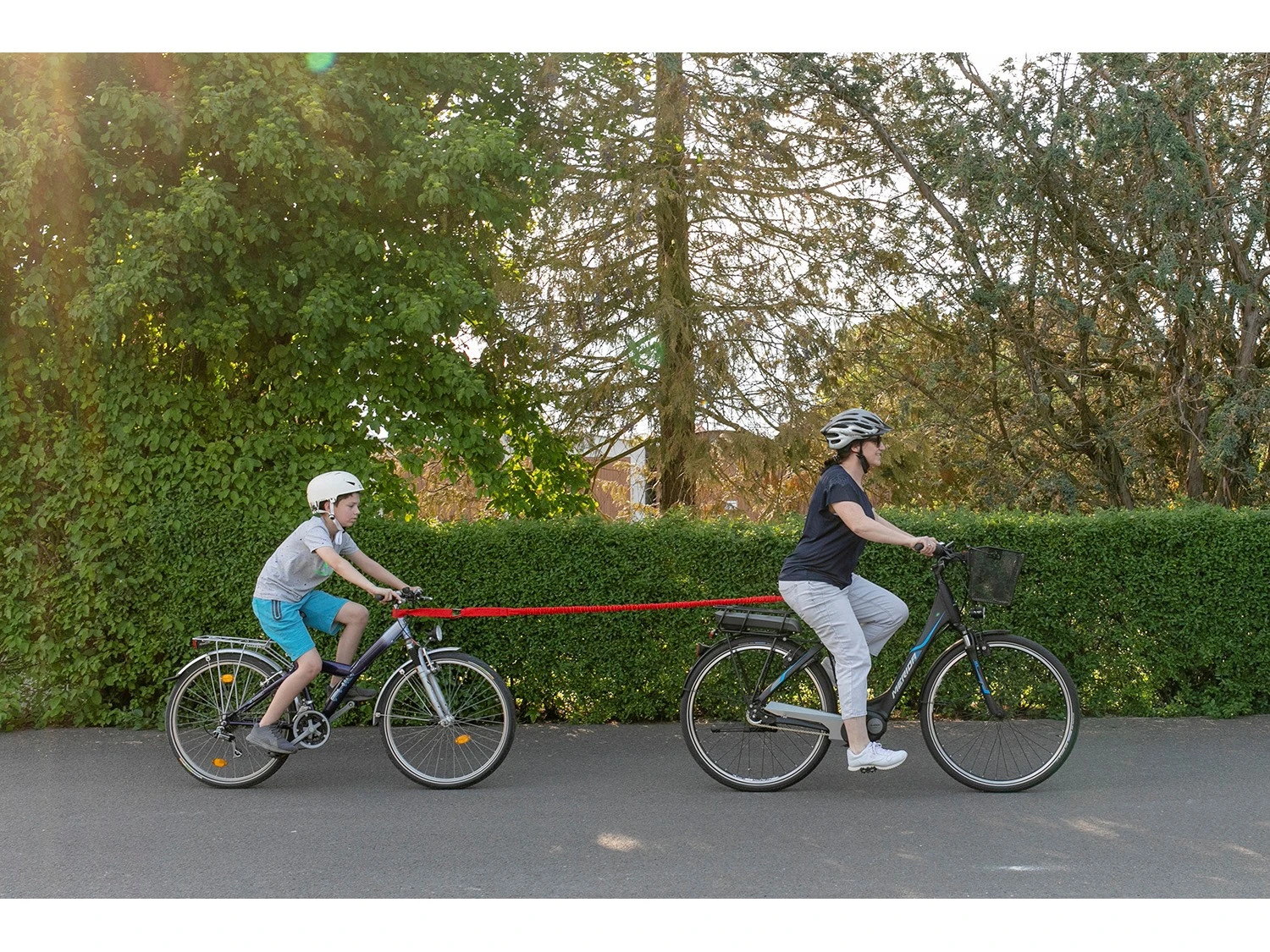Med M-Wave MTB Trail Rope kan du få ungerne med op over bakkerne, når du er ude at køre MTB. Trail Rope er et elastisk træktov, som du fastgør til barnets cykel, og dermed har mulighed for at hjælpe til på de stejleste opkørsler. Trail Rope er nemt at fastgøre omkring cyklens frempind, ved hjælp af den medfølgende karabinhage.