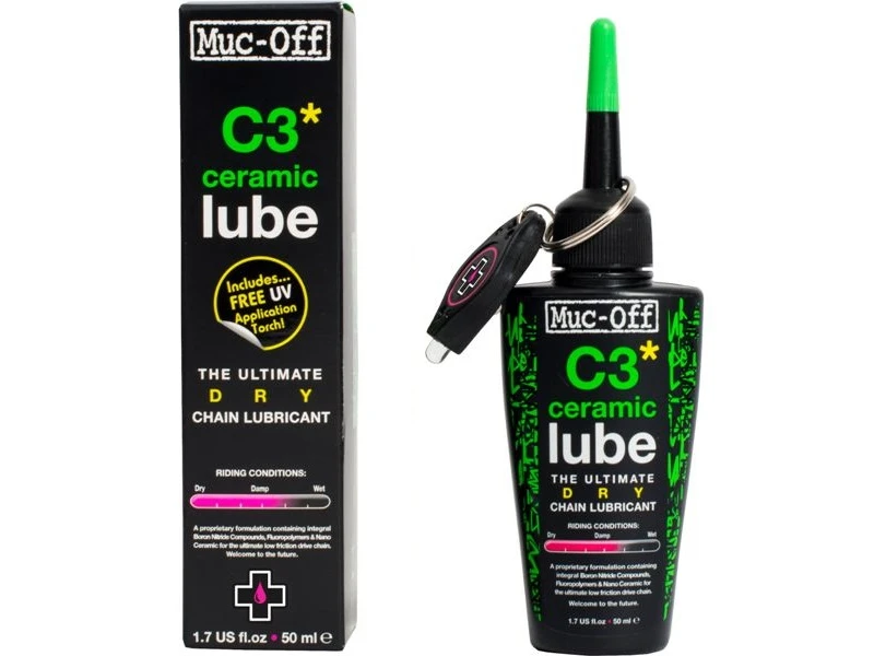 Muc-Off C3 Dry Ceramic Lube 50ml er en yderst effektiv og biologisk nedbrydelig kædeolie, der er er skabt særligt til tørre, støvede eller fugtige vejrforhold. Kædeolien leverer det allerypperste inden for rustbeskyttelse, og den er skabt med en enestående formel indeholdende nanopartikler og syntetiske polymerer for lav friktion og op til 10 gange bedre performance end ved brug af normal kædeolie.