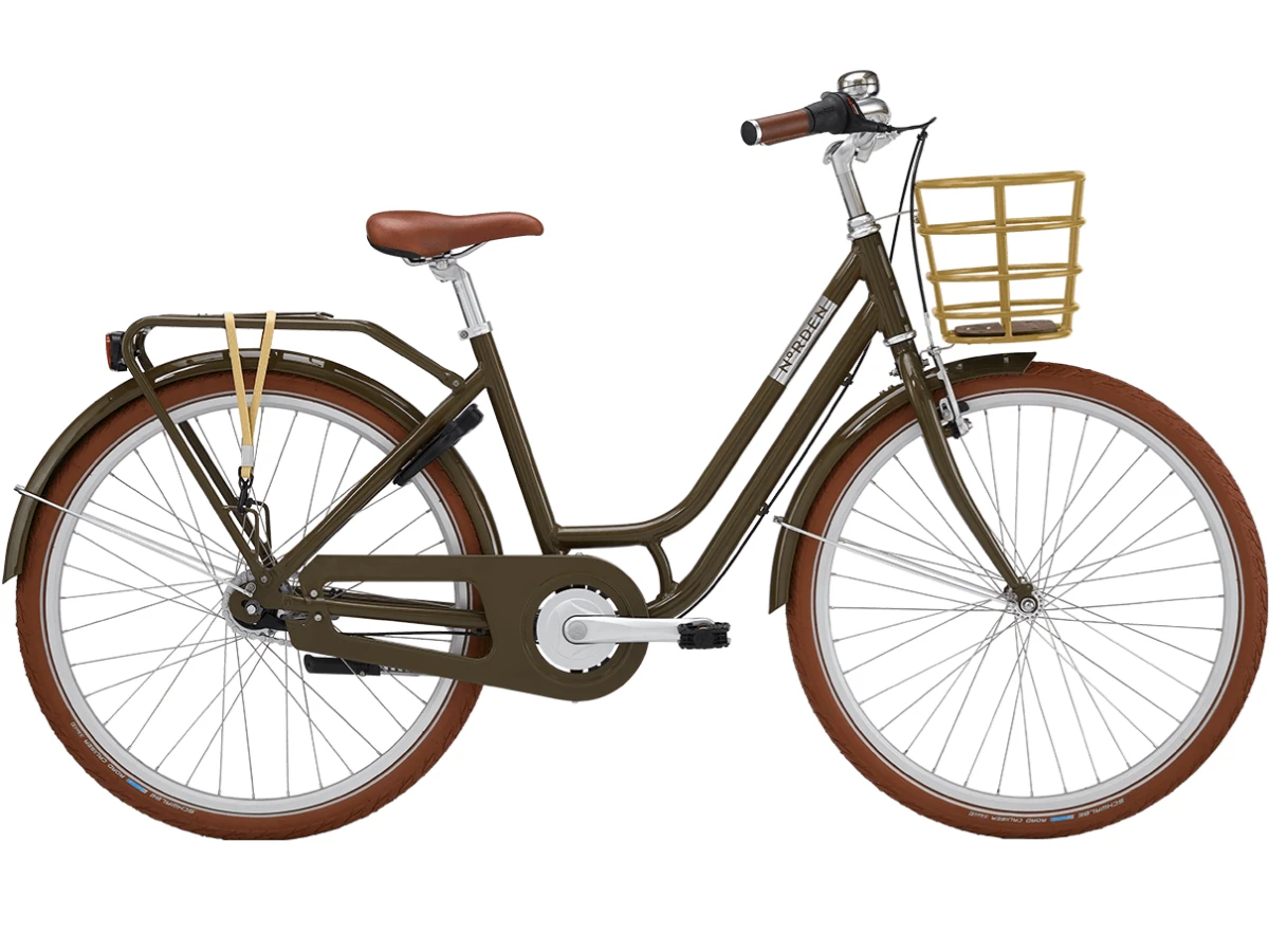 Clara 24″ er moderne nostalgi til stilbevidste piger. Det feminine design går hånd i hånd med robuste materialer og moderne teknik, som gør cyklen meget let at træde. Veludstyret er den også: Smart og praktisk cykelkurv, solid bagagebærer med strop, 3 indvendige Shimano-gear, ægte læderhåndtag og en retro-klokke, der virkelig kan høres. Shimano V-bremsen og fodbremsen sørger for, at du standser sikkert igen.
