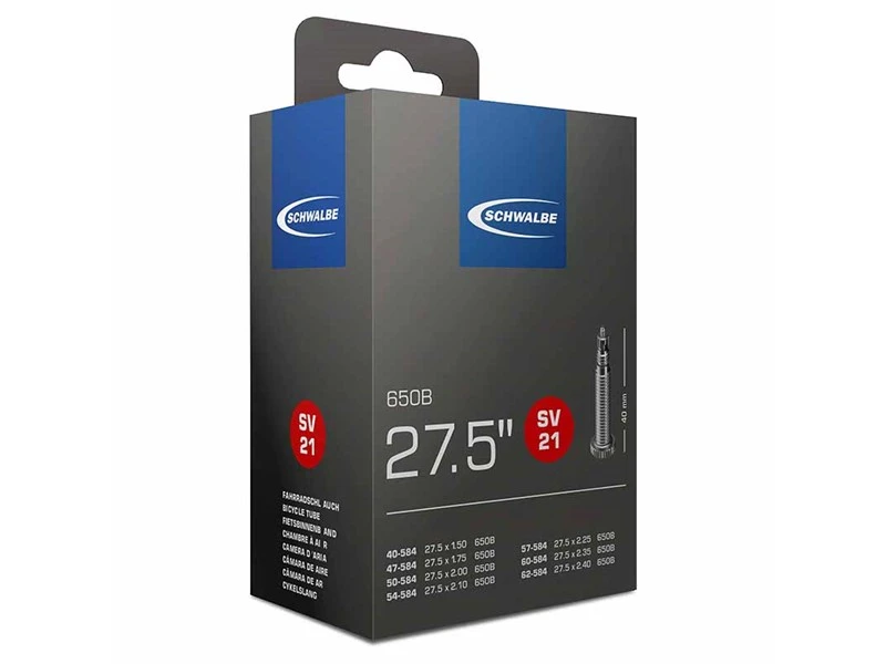 Schwalbe 27.5×1.50 – 2.40 Racerventil (SV21) er en cykelslange til mountainbikedæk med racerventil. Cykelslangen har en fremragende kvalitet og er fremstillet i syntetisk butyl-gummi, der både sikrer god luftfastholdelse og smidighed. Den lave vægt er på kun 205 gram, og slangen er desuden gennemtestet ifølge Schwalbes strenge kvalitetsstandarder. Schwalbe-slangens racerventil kommer desuden med en kerne, der let tages ud og udskiftes, hvis behovet skulle opstå.