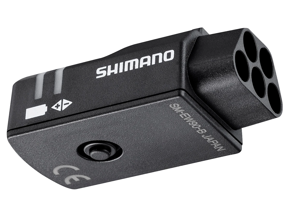 Shimano Di2 tilslutningsboks med 5 porte, til montering på frempind. Tilslutningsboksen er beregnet for tilslutning af E-TUBE kablerne fra skiftegrebene, evt. ekstra skiftekontakter på aerobøjler, samt kablet til for,- og bagskifter. Shimano EW90-B har indbygget batteri-indikator, stik til opladning, samt knap til indstilling af gear.