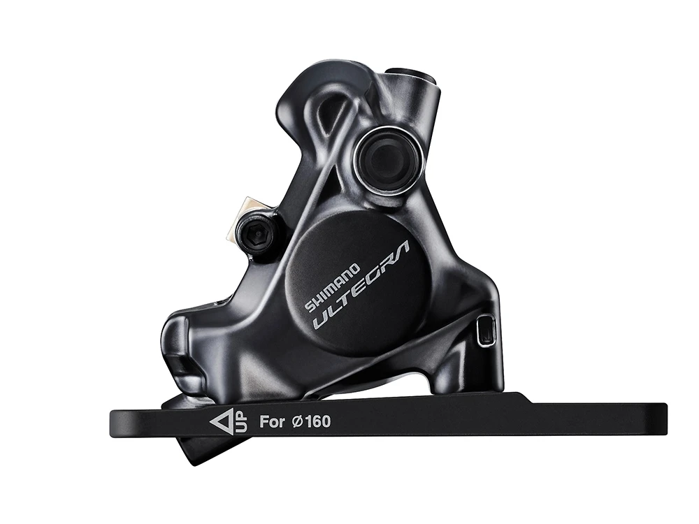 Shimano Ultegra bremsekaliber til anvendelse på forbremse på racercykler med hydrauliske skivebremser og 160mm skive. Den er med straight slangesamling og flat mount.