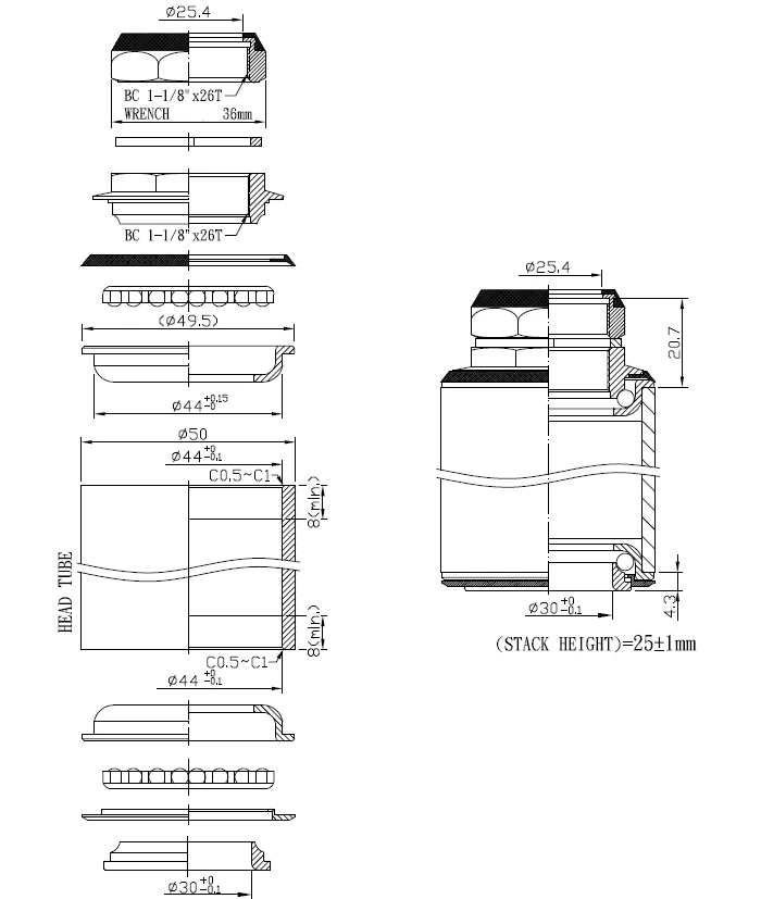 Dette universelle styrfittingssæt i stål passer til kronrør i størrelsen 1 1/8″. Der medfølger alt det du ser på billedet; se også splittegning